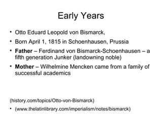 Otto von Bismarck was a Prussian statesman who served as Chancellor of Germany from 1871 to 1890. He came from a noble Prussian family and studied law. Through a series of wars in the 1860s, Bismarck helped Prussia defeat Denmark, Austria, and France to unite Germany under Prussian leadership. He orchestrated the unification of Germany in 1871 and served as its first Chancellor. Bismarck introduced Germany's social welfare state in the 1880s to counter socialists. He retired in 1890 and spent his final years in Friedrichsruh, where he died in 1898.
