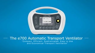 The document describes the e700 automatic transport ventilator. It is lightweight at 2.4kg and has a long battery life of 18 hours. It has multiple ventilation modes and a single screen for live parameter monitoring and waveform display. It has a compact design and is easy to use while also being economical.