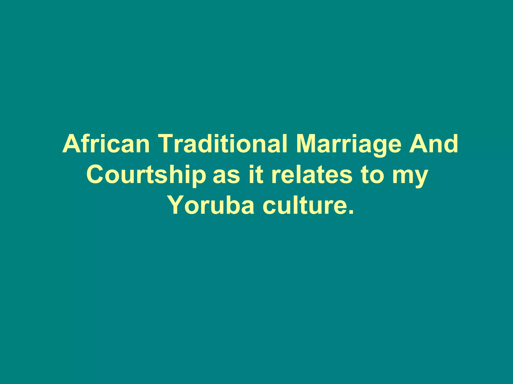 The document summarizes the traditional marriage process and roles in Yoruba culture. Courtship begins between ages 18-28 as young people identify potential spouses. Marriage involves six steps, culminating in the bride moving to her husband's lineage after the bride-price is paid. This includes symbolic items like honey, salt, and palm oil that represent blessings for the couple like fertility and long life. The husband's role is to provide, protect, and lead as priest, while the wife supports her husband, mothers the home, and nurtures children. In-laws advocate for the family and provide counsel. Overall, marriage establishes the foundation for family, which is the most sacred institution in Yoruba culture.