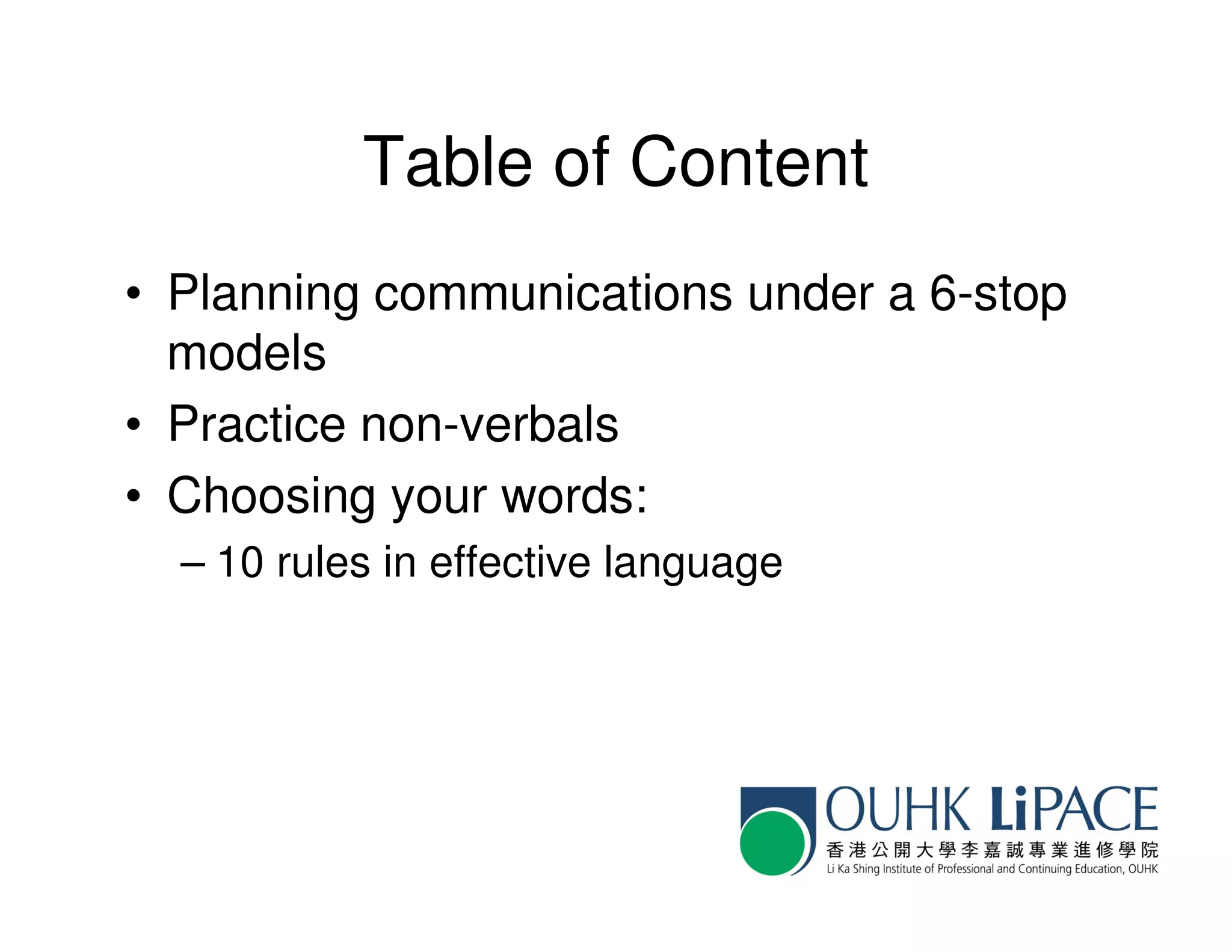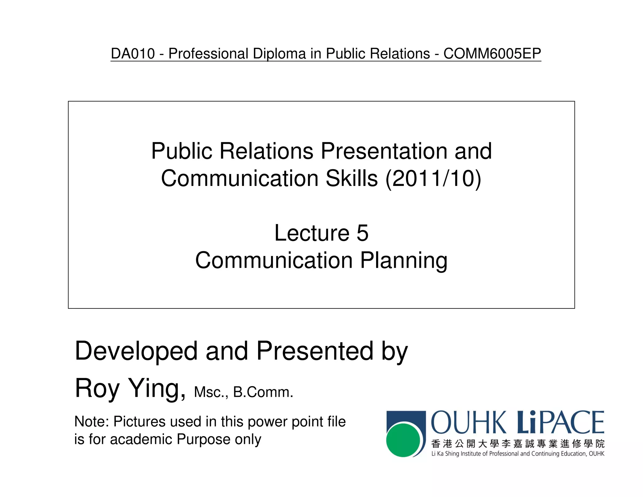 This document provides an overview and summary of a lecture on communication planning. It discusses a 6-step model for planning communications that includes identifying objectives, recipients, channels, matching messages to recipients, getting feedback, and developing an action plan. It also covers non-verbal communication, cultural differences, and 10 rules for effective language including simplicity, brevity, credibility, consistency, novelty, sound, visualization, asking questions, and providing context. The document concludes with an assignment on interview skills.