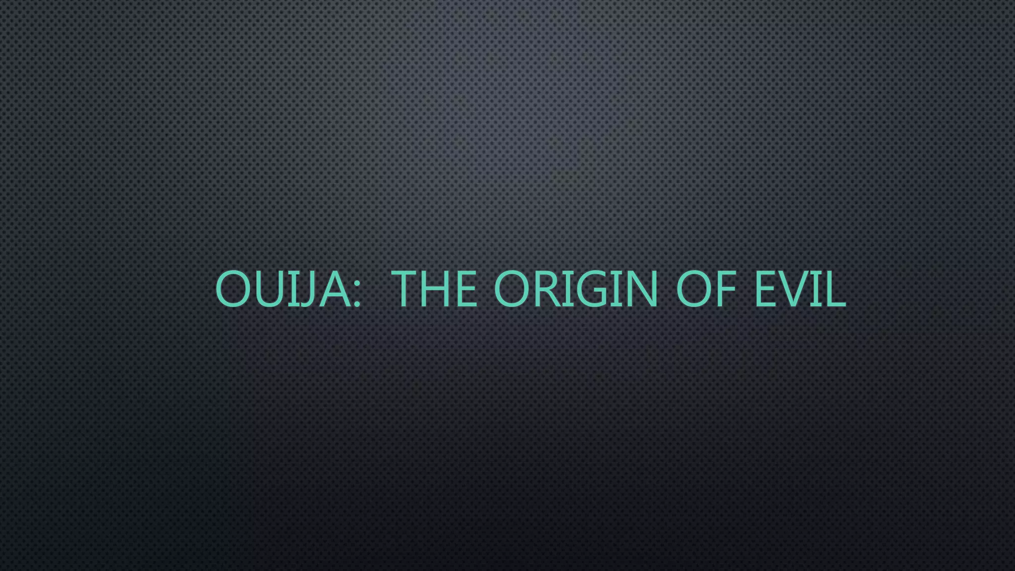 This document provides information about the 2016 horror film "Ouija: Origin of Evil". It summarizes the plot, which follows a widow and her two daughters who use a Ouija board to scam clients at their seance business, unintentionally inviting real evil into their home. When the youngest daughter becomes possessed by a merciless spirit, the family must confront their fears to save her and send the possessor back to the other side. The document also lists the director, release date, production companies, and other key details about the film.