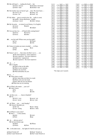 This document appears to contain a practice test with 50 multiple choice questions about grammar concepts in English. The questions cover topics like verbs, pronouns, prepositions, word order, tense, and more. For each question, the reader is asked to choose the most appropriate option to complete a short sentence or dialogue.