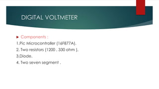This document describes two electronic devices: a digital voltmeter and a controlled voltage power supply. The digital voltmeter uses a PIC microcontroller, resistors, diodes, and seven-segment displays to measure input voltages between 0-5V. The controlled voltage power supply uses a PIC, DAC, op-amp, and push buttons to output a controlled voltage between 0-10V. It sends signals from the PIC to the DAC to the op-amp to produce the desired output voltage when the buttons are pressed. Biasing from a power supply is needed to operate the various components.