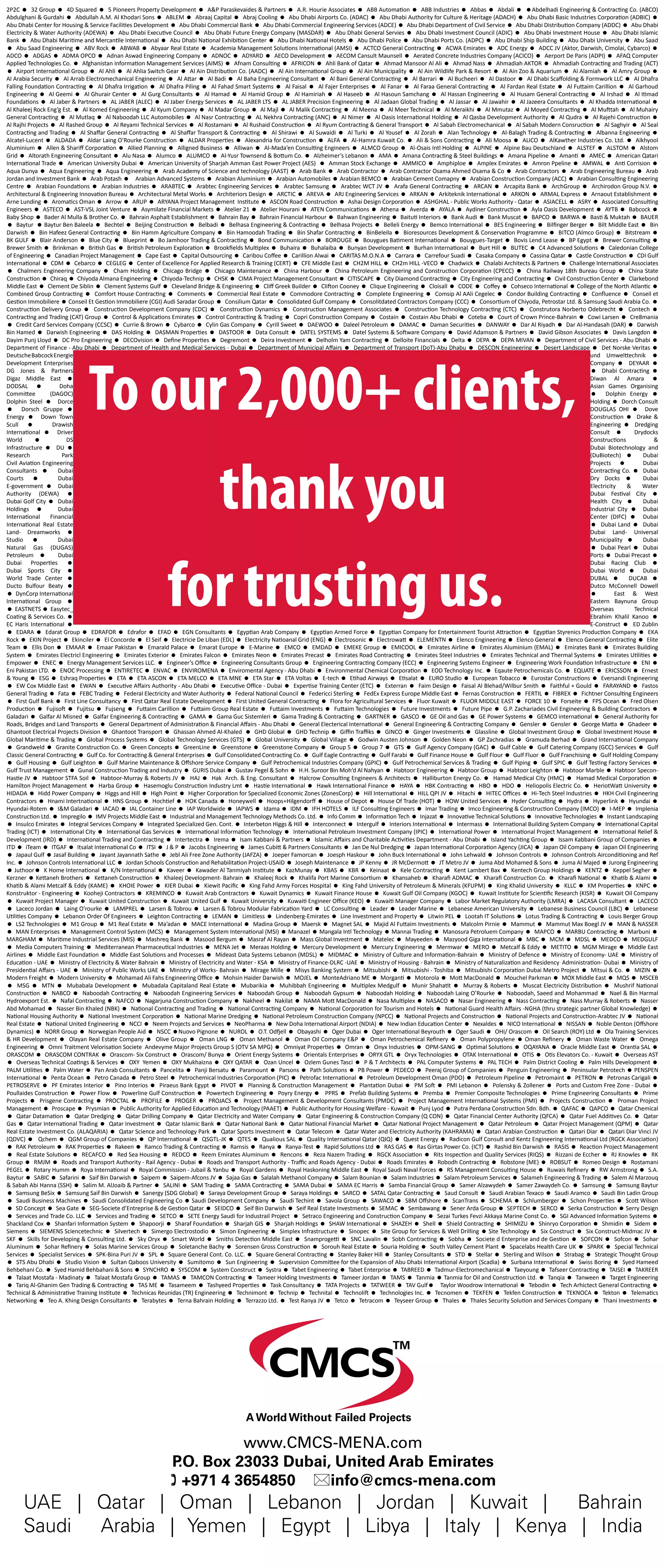 The document contains a long list of company names and abbreviations from various industries and sectors including construction, engineering, real estate, utilities, oil and gas, telecommunications, and government entities primarily located in the Gulf region.