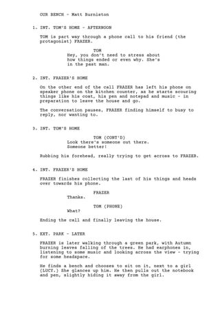 FRAZER has just ended a phone call with his friend TOM about getting over his ex-girlfriend. FRAZER goes to the park to clear his head. At the park, he sits on a bench next to a girl named LUCY. They strike up a conversation where LUCY learns that FRAZER writes stories in his notebook. LUCY gives FRAZER her phone number before leaving. As she walks away, FRAZER crosses out the "less" in "hopeless" written in his notebook, changing it to "hopeful".