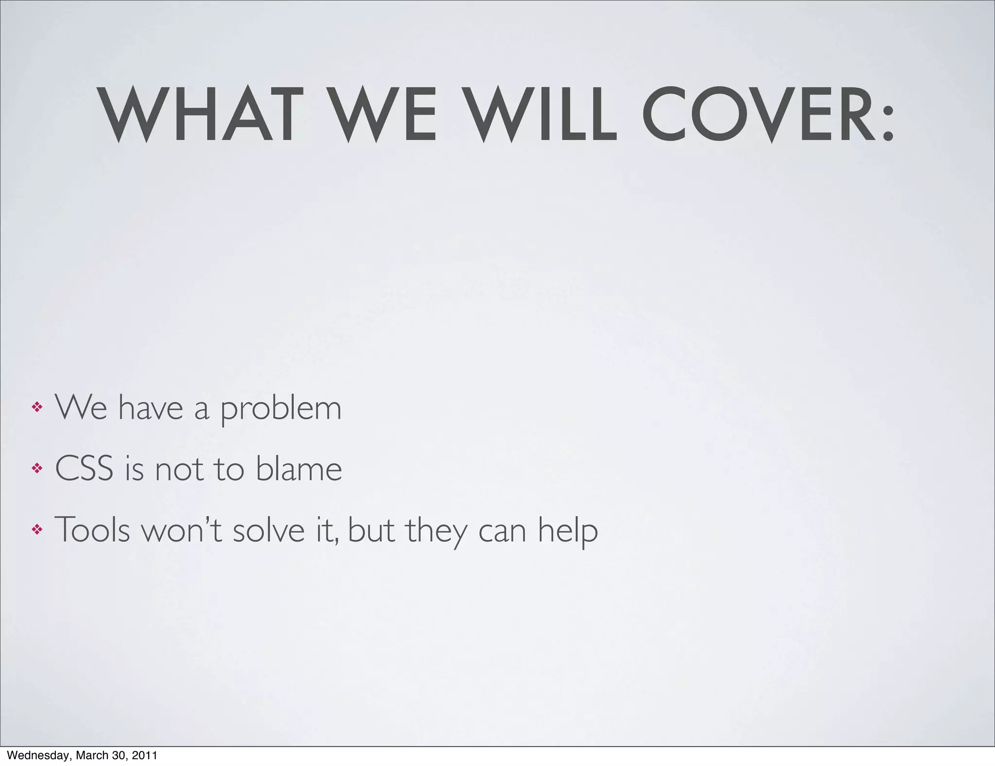 The document discusses the issues with CSS practices, highlighting that many websites, including major ones, have redundancy problems in their styling declarations. It critiques common best practice myths and how they contribute to specificity wars in CSS, making it difficult to manage styles effectively. Furthermore, it emphasizes that while tools can help, they do not solve the underlying problems caused by these practices.