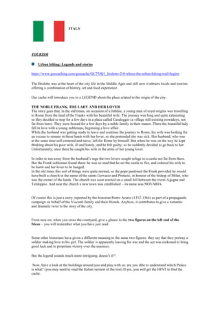 This document provides information about an urban hiking trail and geocaching activity in Novara, Italy. It begins with a legend about the origins of the city involving a Frankish nobleman, his wife, and her lover. It then describes the buildings that make up the Broletto complex in Novara, including the Palazzo dell'Arengo, Palazzo Paratici, Palazzo della Podestà, and Palazzo dei Referendari. The document outlines a treasure hunt involving scanning QR codes located around the Botanical Garden to learn about plants used for food. It provides clues to find each QR code and questions to answer about the plants discussed.
