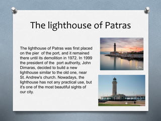 This document provides information about various landmarks and places of interest in the city of Patras, Greece. It discusses the lighthouse of Patras, Saint Andrew Cathedral, Agiou Nikolaou street, the Castle of Patras, the Roman Odeum, Psila Alonia square, King George's Square, the Apollon Theatre, the city hall, Patras Carnival, Achaia Klaus winery, Pampeloponnisiako Stadium, the Archaeological Museum of Patras, the Rio–Antirio bridge, and the University of Patras.