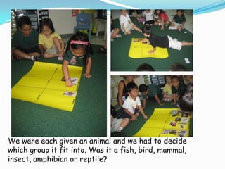 The students played an animal sorting game to categorize animals into groups like fish, birds, mammals. They then drew their favorite mammals and made a list of the ones drawn, which included pigs, sheep, horses, tigers, rhinos, elephants, monkeys, cats, dogs and rabbits. After voting to narrow the list down, the top five mammals were tigers, monkeys, horses, cats, and dogs. There was a tie for first between tigers and horses, so the teacher cast the deciding vote for horses, making them the official class name.