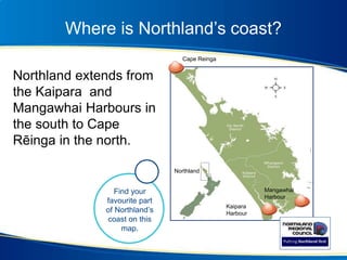 The document discusses Northland's coastline in New Zealand, including its geographic features, habitats, and importance. It notes that Northland's coast extends from Kaipara and Mangawhai Harbours in the south to Cape Reinga in the north, and includes inlets, estuaries, sand dunes, rocky shores, sandy beaches, and 17 harbors. Various organizations work to protect and manage the coast, including the Northland Regional Council, Department of Conservation, district councils, and local communities through initiatives like CoastCare. The coast is important for recreation, culture, wildlife habitat and migration.