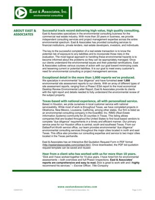 East & Associates provides environmental consulting services including Phase I and Transaction Screen Environmental Site Assessments, environmental letter reports, and general consulting services. They have over 20 years of experience in the environmental consulting field for commercial real estate. Their services include on-site evaluations of properties, regulatory database searches, and report preparation to identify potential environmental risks and liabilities.