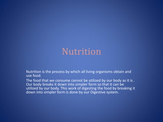 The document summarizes the key parts and processes of the human digestive system. It explains that food is ingested and then broken down through digestion, absorption, and assimilation before waste is egested. The main parts that work together are the alimentary canal (mouth, esophagus, stomach, intestines) and digestive glands like the liver and pancreas. Enzymes and acids in saliva and digestive juices break food down step-by-step as it passes through the system.