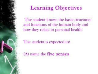 The five senses are sight, touch, taste, smell, and hearing. The document provides examples of how each of the five senses are used, such as using our eyes to read, using our hands to touch things, using our mouth to taste food, using our nose to smell flowers, and using our ears to listen to music. It aims to teach kindergarten students about the basic structures and functions of the human body related to the five senses.
