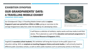 This mobile exhibit from the National Museum of Singapore aims to bring museum learning to secondary schools. It will feature replicas, photos and videos from the museum's collection to tell the stories of average Singaporeans from the 1950s to 1980s. The exhibit is designed like other mobile museums and will spend one week in schools, especially those unable to visit the physical museum. Programming and digital technology are used to engage students and bridge generations by exploring daily life in Singapore as it developed from a post-war nation.