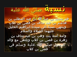 The document lists the genealogy and family members of the Prophet Muhammad, peace be upon him. It traces his lineage back to Ishmael the son of Abraham. It then lists his wives, children, uncles, aunts and other close relatives. All of his children except Fatimah died young. The document provides details on his descendants through his surviving daughter Fatimah.
