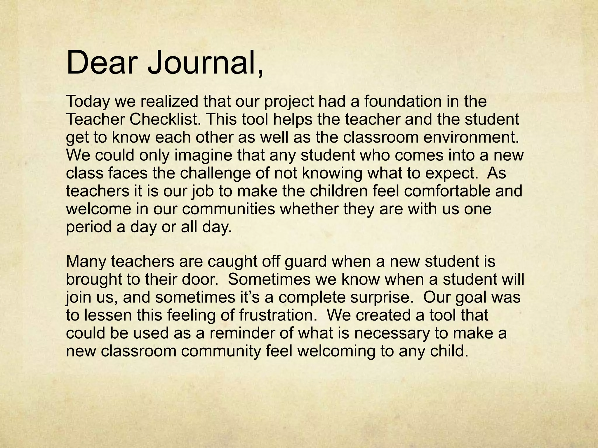 The document describes the evolution of assessment tools created by teachers to help new students acclimate to new classrooms. It starts with a Teacher Checklist to help teachers and students get to know each other and the classroom environment. The teachers then created exit slips for students to provide feedback on lessons and note areas they need help with. Finally, the teachers developed math and literacy checklists based on Common Core standards to quickly assess student performance and identify areas needing more support. The checklists allow teachers to differentiate instruction and hold students accountable for their learning.