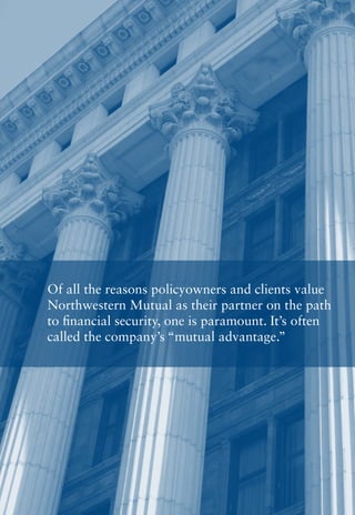 Northwestern Mutual has a mutual structure that allows it to focus solely on its customers rather than shareholders. As a mutual company, profits are returned to policyholders in the form of dividends rather than going to shareholders. This mutual structure provides advantages for policyholders like equitable treatment, improvements to existing policies at no additional cost, and a long-term investment approach. Northwestern Mutual's mutual structure and customer-focused values have enabled it to remain financially strong and earn recognition as one of the best life insurers in the country for over 150 years.
