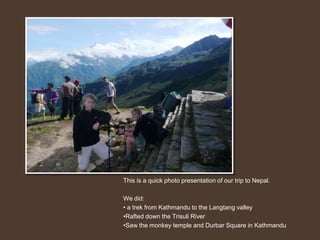 Our family took a trip to Nepal where they hiked from Kathmandu to the Langtang valley, rafted down the Trisuli River, and saw attractions in Kathmandu like the monkey temple and Durbar Square. They hiked for several days with guides and porters, climbing as high as 4,610 meters and seeing beautiful scenery. They visited villages along the way and saw wildlife like yaks. The trip involved challenging hikes, scenic views, and local cultural experiences.