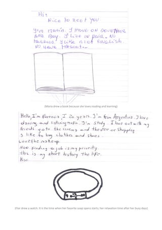 The document features personal drawings and reflections from students and their teacher in an English course, showcasing their passions, interests, and backgrounds. Each individual expresses their unique identity through art, such as books, sports, music, and personal stories. The teacher, Sabrina, emphasizes her love for teaching, diversity, and dance, highlighting the connection between education and art.
