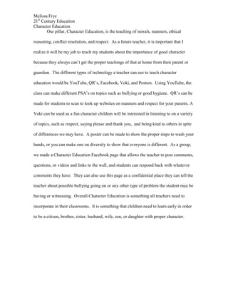 Character education teaches morals, ethics, manners, conflict resolution, and respect. As a future teacher, the author will teach these important lessons, as students may not learn them at home. Different technologies like YouTube, QR codes, Facebook, Voki, and posters can be used to engage students on topics like bullying, manners, respect, and hygiene. For example, students can scan QR codes to learn about manners and respect, or watch videos on a Voki character. A Facebook page allows the teacher to post and students to comment on issues like bullying. Overall, character education is essential for students to develop good character as citizens and family members.