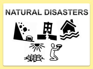 This document discusses four types of natural disasters: floods, droughts, famines, and landslides. It defines each disaster and provides a crossword puzzle clue for each one. Floods are defined as a large amount of water covering the land. Droughts are periods with no rain. Famines are times when there is not enough food. Landslides are sudden movements of earth or rock down hills or mountains.