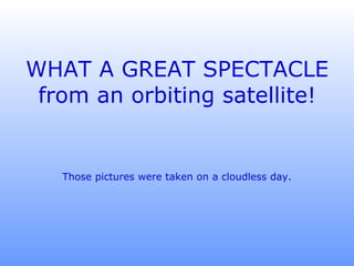 The document provides satellite images taken at night that show various cities and geographical features lit up across multiple continents. Key details that can be seen in the nighttime photos include major cities in Europe, North America, South America, Africa and Asia, as well as natural landmarks such as the Swiss Alps, Iceland, the Black Sea and the Red Sea. The photos demonstrate the beauty of the Earth when viewed from space at night.