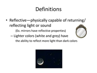 This document provides background information and instructions for activities about the moon's reflection of sunlight. In the introduction activity, students use a flashlight to observe which of three items - a red reflector, orange reflector, or mirror - is most reflective. In the main activity, students use styrofoam models of the Earth and moon along with a flashlight to simulate how the moon reflects sunlight onto Earth. The document explains that the moon's light color allows it to reflect sunlight so we can see it during the day or night.