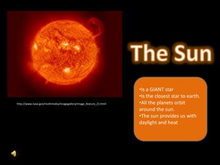 The sun is the closest star to Earth and all the planets orbit around it. It provides us with daylight and heat. Mercury is the smallest planet and closest to the sun. It has no atmosphere or moons. Venus is covered in hot clouds and volcanoes. It is the second planet from the sun. Earth is the third planet and the only one known to support life. It has one moon. Mars has a rocky surface and dust storms. It is the fourth planet and has two moons. Jupiter is the largest planet and has four large moons and 12 small moons. Saturn has rings made of ice and 18 moons. Uranus takes 84 years to orbit the sun and is made mostly of ice.