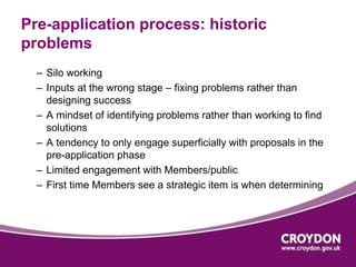 The document outlines the Croydon pre-application process, aimed at improving development quality through enhanced collaboration between developers, members, and the community. It introduces a new Development Team Service (DTS) for complex projects, emphasizing structured engagement, project management, and effective stakeholder participation. The adoption of a proactive approach has fostered a culture shift towards pro-development, leading to better outcomes in Croydon's planning landscape.