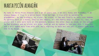 Marta Picon Almazan is a 13-year-old girl who lives in a white house in La Garriga with her parents, grandmother, two brothers, sister, sister-in-law, and nephew. She attends Ies Vila Romana high school and enjoys reading, watching Netflix, and dancing ballet and jazz in her free time.