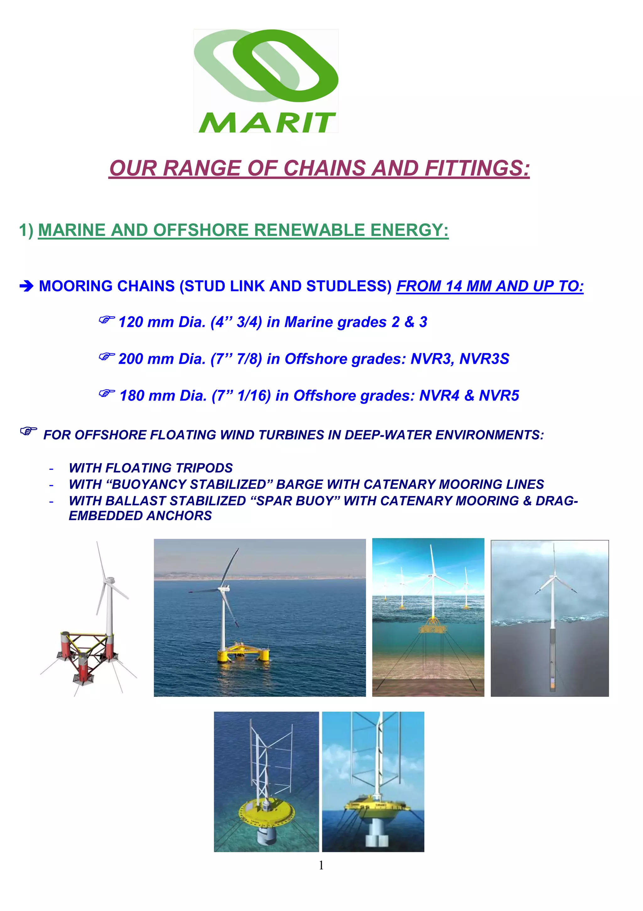 This document provides an overview of the range of chains and fittings available from the company for various marine and offshore applications. It describes mooring chains from 14mm to 200mm diameter for floating offshore wind turbines, wave and tidal energy devices, and oil and gas moorings. It also lists fittings that can be mounted on mooring chains like shackles and swivels. Additional chains are available for installation of hoses and pipes as well as for anchoring, fendering, shipbuilding, and defense applications.