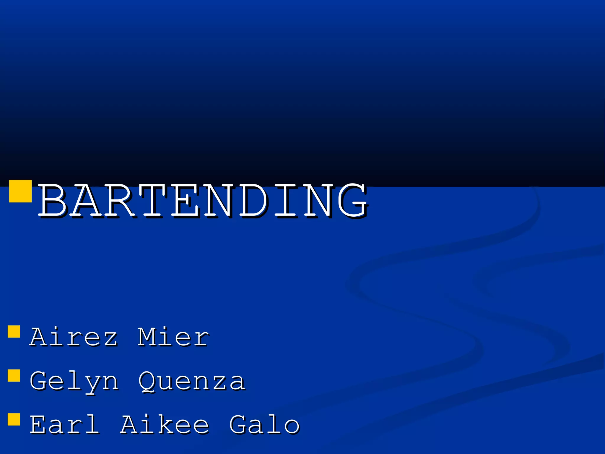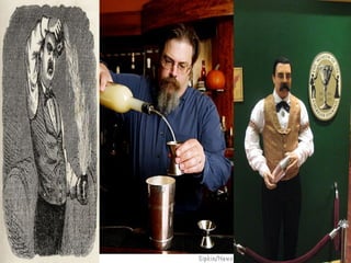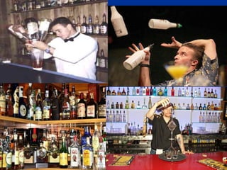 Bartending has a long history dating back thousands of years to ancient Rome and Greece. Jerry Thomas in the 1800s is considered the "Father of American Mixology" and wrote the first published bartending guide. Today, bartenders provide customer service, prepare drinks, and sometimes act as entertainers or performers through techniques like flair bartending. Good bartenders need strong social and customer service skills to create a welcoming environment and memorable experiences for patrons.
