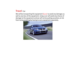 The document provides a risk assessment for filming a music video. It identifies potential hazards from transporting equipment by car, using cameras and lighting, weather conditions during outdoor filming, and filming at different house locations. Safety measures are outlined such as transporting all equipment safely in the car, ensuring lights are off before touching them to avoid burns, using umbrellas and careful walking in the rain, and filming indoors to control the environment.