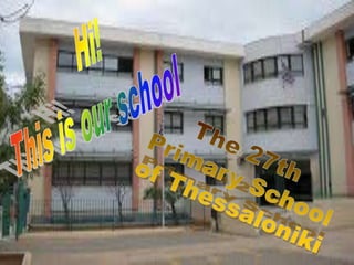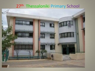 Our school is the 27th Thessaloniki primary school located on 15th Kesarias street. It is a large school with 15 classrooms, a gym, offices for teachers, music, art, and computer rooms. There are 237 students and 24 teachers who enjoy learning together in this school that has basketball, handball, and volleyball facilities in its large schoolyard.