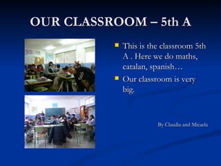 The document describes the different rooms and areas of a school. It discusses the classrooms, English classroom, gym, computer room, playground, dining room, headmaster's office, porter's office, staff room, and secretary's office. For each area, it provides details on its use and who works or teaches there.