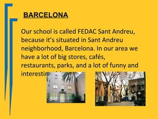 Our school is called FEDAC Sant Andreu, located in the Sant Andreu neighborhood of Barcelona. It is around 150 years old with 650-700 students across many classrooms, halls, dining rooms, and four playgrounds. There are about 50 teachers and the schedule varies between starting at 8am or 9am, normally finishing at 5pm on most days but 1:30pm on Wednesdays. The school celebrates various holidays and events throughout the year like Carnival, Christmas, and the founder's day. Extracurricular activities offered include many sports, water sports, dance, languages, and arts that students can participate in after school and on weekends.