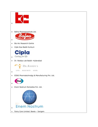 This document lists the names of various pharmaceutical companies and manufacturing facilities located in India. It includes major companies like Cipla, Dr. Reddy's, Lupin, Sun Pharmaceuticals, and Wockhardt along with their manufacturing plants in locations such as Baddi, Goa, and Mumbai. Over 50 pharmaceutical manufacturers are listed.