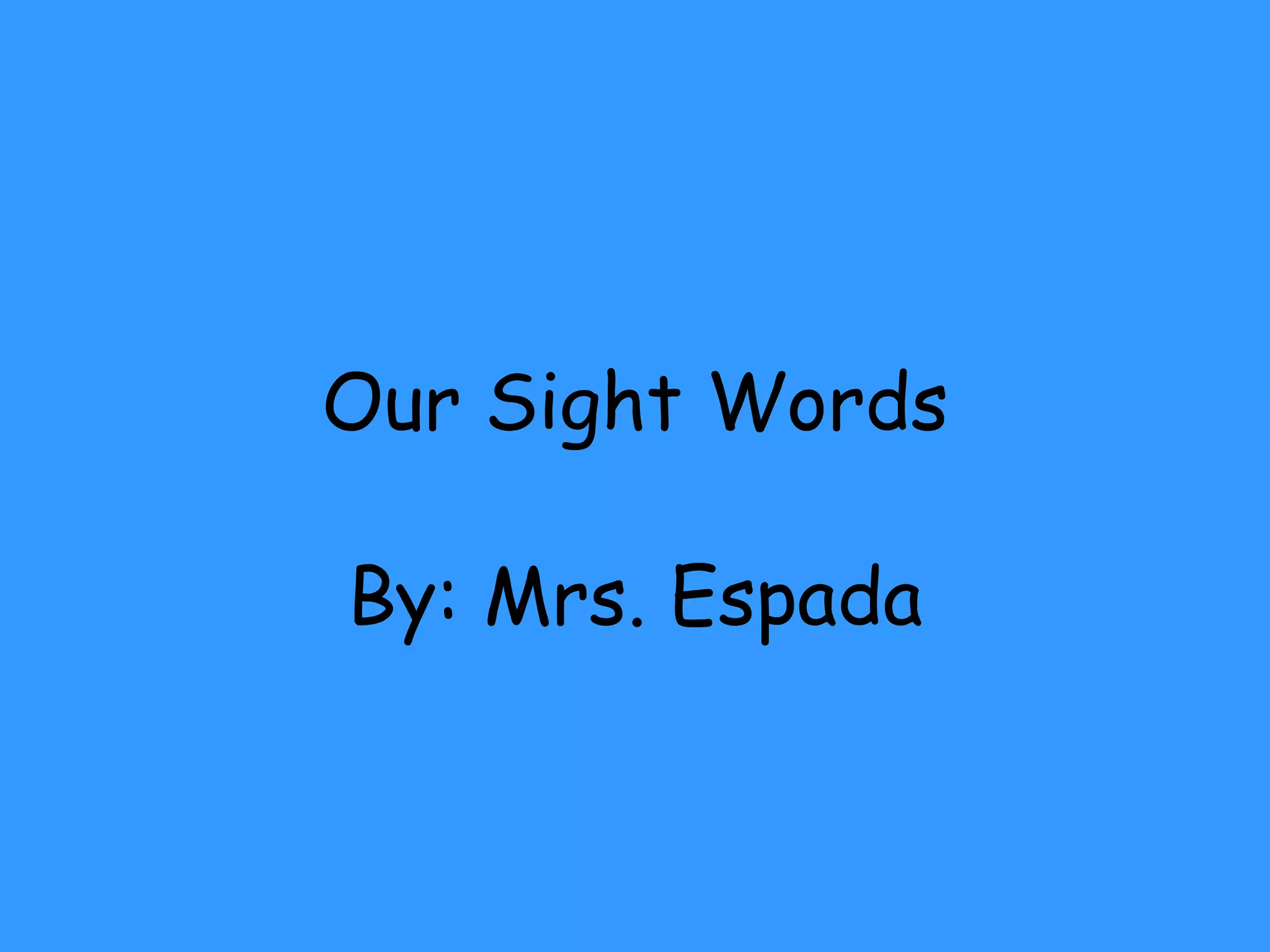 This document lists sight words that are commonly found in children's reading materials. It includes basic words like "the", "and", "to", as well as descriptive words such as "big", "pretty", and colors. Action words are also included, such as "run", "jump", "eat". The list was created by Mrs. Espada to help children learn foundational words.