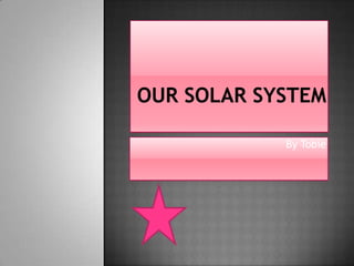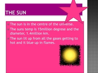 The sun is at the center of the solar system and has a temperature of 15 million degrees Celsius with a diameter of 1.4 million km. It produces light and heat through nuclear fusion in its core. Mercury, Venus, Earth, and Mars are the inner, solid planets, while Jupiter, Saturn, Uranus and Neptune are the outer, gas giants. Key facts are provided about each planet's distance from the sun, composition, temperature, orbit and other characteristics. The document sources its information from Wikipedia, NASA publications and websites, science books, and other people.