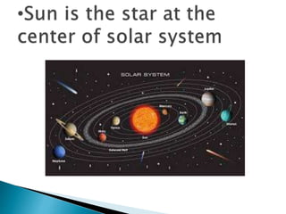 The sun is the central star of the solar system, providing light, heat, and energy for life on Earth. It rises in the east and sets in the west, while the solar system consists of eight planets, with Mercury being the smallest and Jupiter the largest. Additionally, the Earth is referred to as the blue planet, and there are four terrestrial planets and four gas giants.