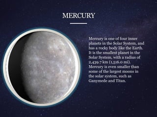 The document summarizes key facts about the planets in our solar system. It describes Mercury as the smallest planet with a rocky body like Earth. Venus has a dense atmosphere that traps heat, making it the hottest planet. Earth is located in the third orbit from the sun and has liquid water and an atmosphere suitable for life. Mars is smaller than Mercury and has surface features resembling impact craters on the moon. Jupiter is the largest planet and made of gas like Saturn, Uranus and Neptune, which are also described briefly in the summary.