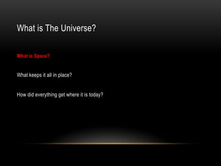 The document provides information about our solar system and the universe. It describes the major components of the solar system including the sun, planets, moons, comets, asteroids and dwarf planets. It then discusses the history of astronomy from ancient civilizations studying the night sky to modern space exploration. It also explains how gravity and orbits allow the solar system to function and how scientists like Newton contributed to our understanding of motion and orbits. Finally, it summarizes the leading scientific theory of the origins of the universe via the Big Bang over 14 billion years ago.