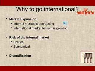 The document discusses Ron Santa Teresa's consideration of expanding internationally. It notes that the internal rum market is decreasing while the international rum market is growing, motivating expansion. It also cites risks of political and economic instability in the internal market. The document provides recommendations on segmentation, targeting, positioning, and distribution channels for international expansion. It then analyzes the rum market and key competitors in Colombia as an initial target market due to logistical advantages and cultural similarities to Venezuela. Other potential target countries are mentioned.
