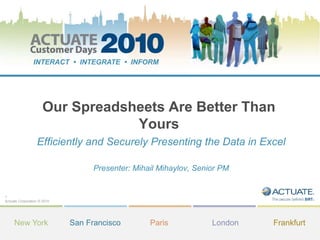 The document discusses the challenges of spreadsheet reporting, noting that a significant percentage of critical spreadsheets contain errors and highlighting the widespread use of Excel in business contexts. It presents Actuate's solutions for automating spreadsheet reports, emphasizing features such as data-driven layouts, Excel expressiveness, and compliance security. The Actuate spreadsheet solutions aim to enhance efficiency, accuracy, and scalability for organizations across various sectors, including finance and education.