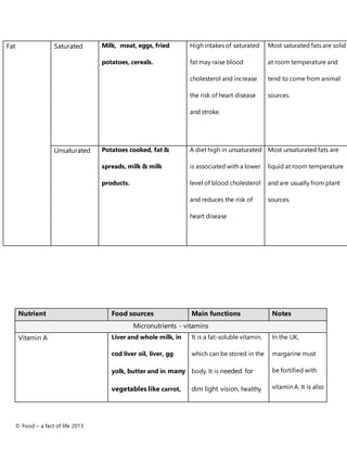 This document provides information about important nutrients including macronutrients like carbohydrates, protein, and fat as well as micronutrients like vitamins and minerals. It lists common food sources of each nutrient and their main functions in the body. For example, it states that carbohydrates from foods like fruits, vegetables and grains provide an important source of energy, while proteins from animal and plant foods are essential for growth and repair. The document also notes vitamins and minerals needed for bone health, immune function, energy production and more.