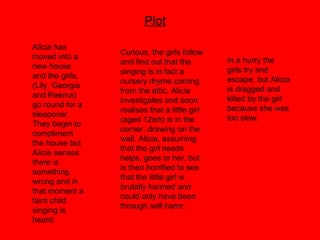 The document provides a plot summary for a supernatural thriller film involving a group of teenage girls. They follow faint child singing to an attic in a new house where they find a self-harming young girl. One of the girls is killed after being dragged by the disturbed girl. Years later, the girls discover the house will host a Halloween party and fear the demon may still be present.