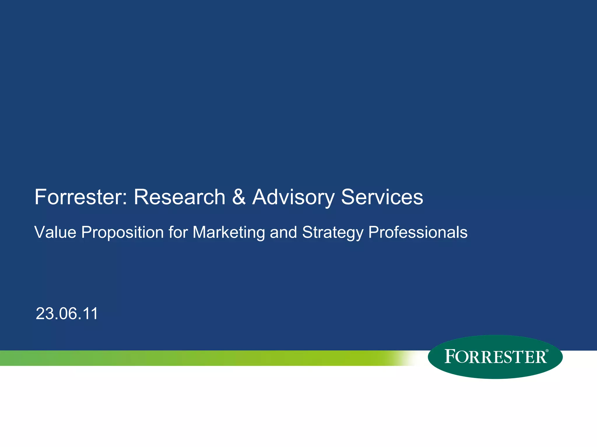This document provides an overview of Forrester Research and the value it provides to marketing and strategy professionals. Forrester is a global research and advisory firm that delivers fact-based insights to support business leaders and guide their decisions. It focuses on serving clients based on their professional roles through highly relevant, research-based services. Forrester provides insights, advisory programs, and consultancy services to help clients understand changing consumer behavior, guide strategic decisions, and benchmark their performance against peers.