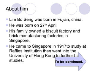 Lim Bo Seng was a war hero from China who came to Singapore to study. He helped raise funds to support China in its war against Japan and encouraged people to boycott Japanese goods. During World War 2, he set up an anti-Japanese group called Force 136 that secretly brought in supplies for soldiers fighting in Singapore and Malaya.
