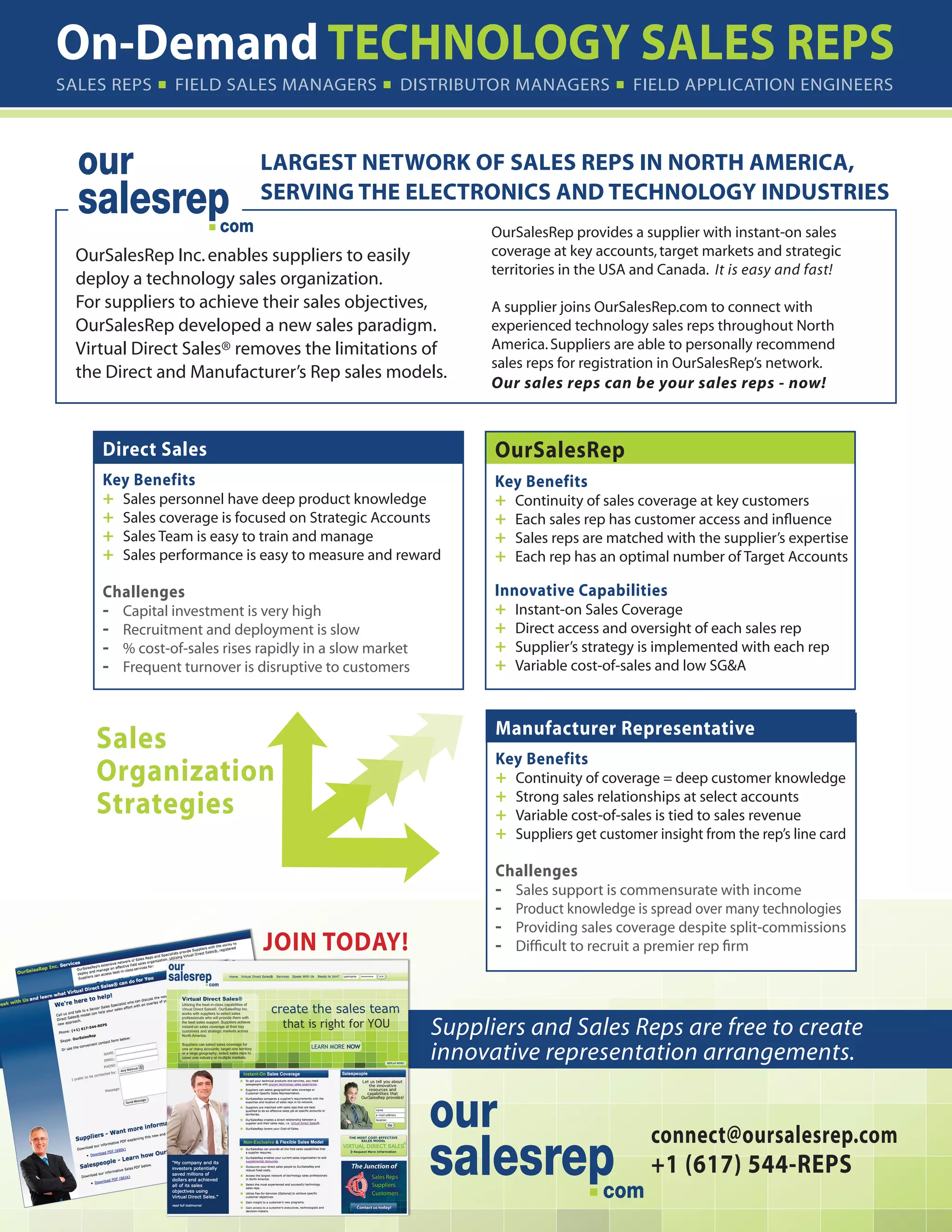 OurSalesRep Inc. enables suppliers to deploy a virtual sales organization by connecting them with experienced technology sales representatives throughout North America. Suppliers can recommend specific sales reps, who then represent the supplier's products and implement their sales strategy. This Virtual Direct Sales model provides suppliers with instant sales coverage at key accounts while avoiding the high costs and slow recruitment of a traditional direct sales force. It also allows sales reps to represent multiple suppliers flexibly while maintaining customer relationships.