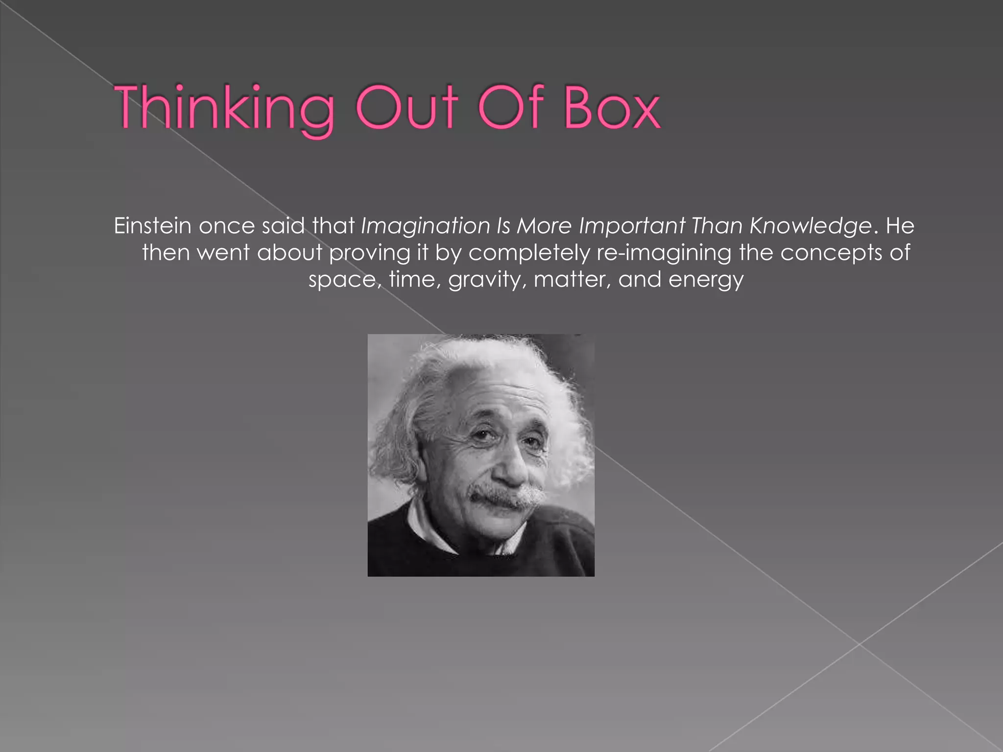 Einstein believed that imagination is more important than knowledge. The document provides examples of how Einstein demonstrated this by completely reimagining fundamental concepts in physics like space, time, gravity, matter, and energy. It also discusses constraints on thinking within organizational "boxes" and encourages thinking outside of typical boundaries.